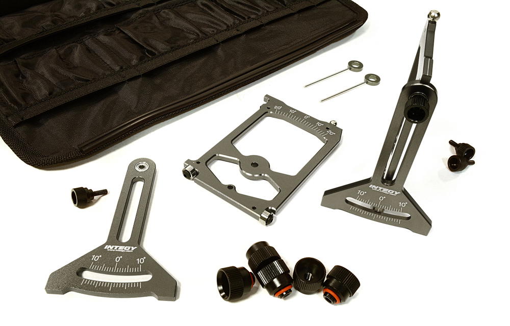 Touring cars and drift cars need proper setup to perform at their best. To make sure all of your suspension angles are correct, use our new Professional Setup Station System for 1/10 Touring Car & Drift Cars. Crafted from Billet machined aluminum and anodized in multiple finishes, the setup station can measure each corner of your vehicle individually for camber, caster, and toe angle. The camber plates rotate on ball bearings for smooth movement and precise readings, and mount to your vehicle with the included alloy thumbscrew axle adaptors. When you're done tuning, the setup station breaks down and is stored in the included carry case. The Professional Setup Station System for 1/10 Touring Car & Drift Cars is available in black, blue, grey, light blue, or red anodizing.