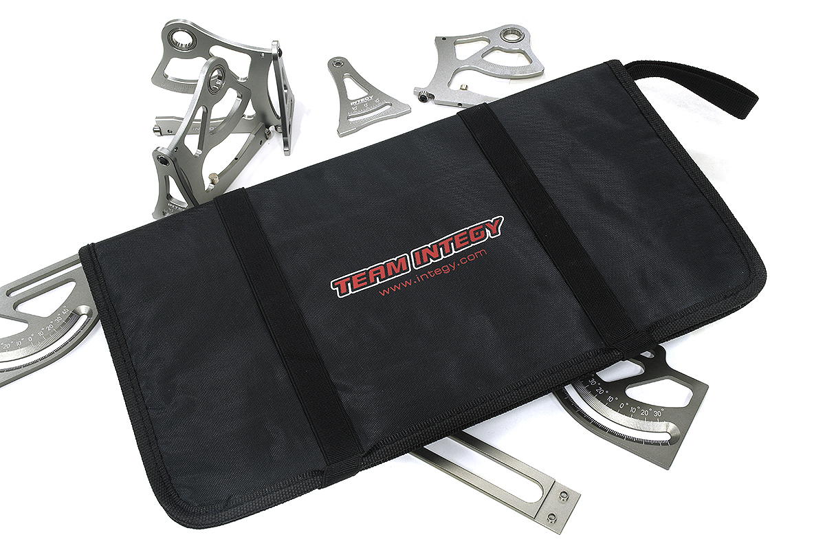If you have ever been to a race track you will know that proper chassis setup is critical, and can be the difference between a DNF and a checkered flag. for 1/8-scale buggy, truggy, and monster truck owners we offer our 30-piece Universal Setup Station System. Crafted from aluminum and anodized in a gunmetal finish, the setup station can measure each corner of your vehicle individually - up to 15-degrees of camber, 30-degrees of caster, and +35/-40-degrees of toe. The measuring plates all ride on ball bearings for smooth movement and precise readings. The included carrying bag features a rubber grip handle and a two-sided zipper for storing the station when you are on the move.