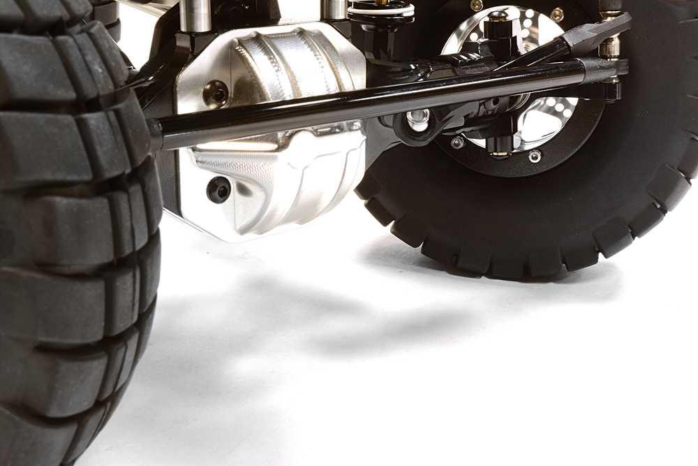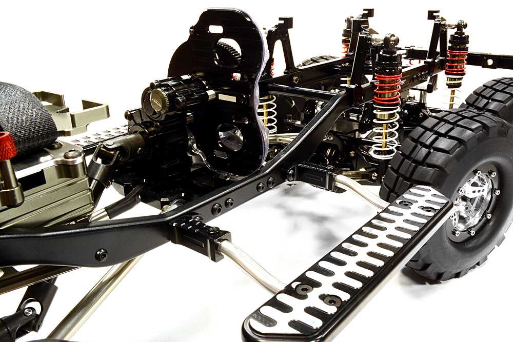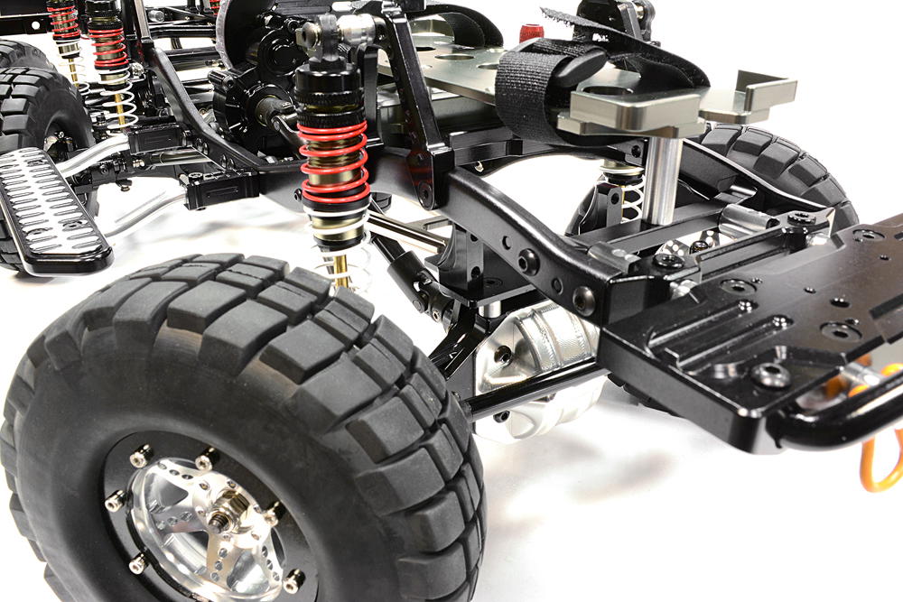 Our full-upgrade spec Trail Roller 6X6AWS chassis just got better with the availability of twin motor power! The new Twin Motor* Trail Roller 6X6 AWS features a new heatsink motor plate that allows you to run a pair of brushed or brushless motors for ultimate crawling and climbing power. Just like our original Trail Roller 4X4, this 1/10-scale 3-axle 6-wheel drive chassis features a full-time drivetrain with 3-gear transmission and metal gear internals, standard issue slipper clutch, alloy HD slider drive shafts, multi-link suspension, Billet-machined realistic alloy shocks, full alloy axles, all-axle steering, full ball bearings; alloy bead lock wheels and pre-mounted rock crawler tires, alloy scale front bumper, alloy scale side steps, and more. The chassis is pre-built and ready for the electronics of your choice. We have the Twin-Motor Trail Roller in black or silver color schemes. (*motors not included)