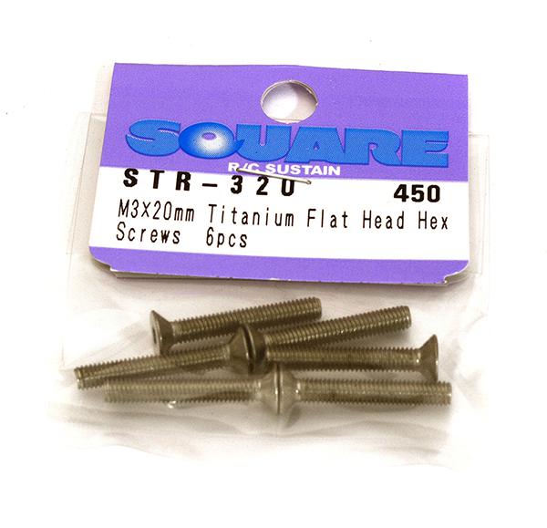 This is a pack of six 3 x 20mm Titanium flat head hex screws by SQUARE R/C. Made in Japan with high quality, high rigidity at about half the weight compared with standard hardware. Item# SQ-STR-320 Barcode: 4543880400530