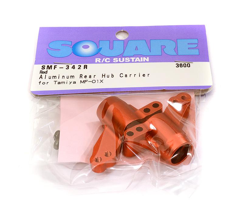 This is an Aluminum rear hub Carrier by SQUARE R/C. Fitment is for the Tamiya MF-01X, and is available in red. Item# SQ-SMF-342R Barcode: 4543880516057