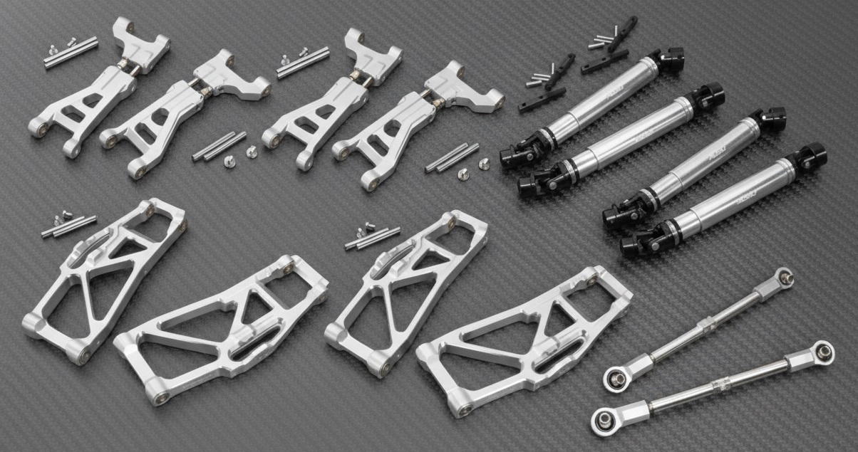 Upgrade performance in one step and add some flashy looks to your 1/10 Maxx V2 w/ WideMaxx with our Billet Machined Suspension Conversion Set. Each set includes the following parts: 2x Front Lower Arms, 2x Front Upper Arms, 2x Rear Lower Arms, 2x Rear Upper Arms, 2x Front Universal Drive Shafts, 2x Rear Universal Drive Shafts, and 2x Steering Rods. The Billet Machined Suspension Conversion Set is available in seven anodized colors.